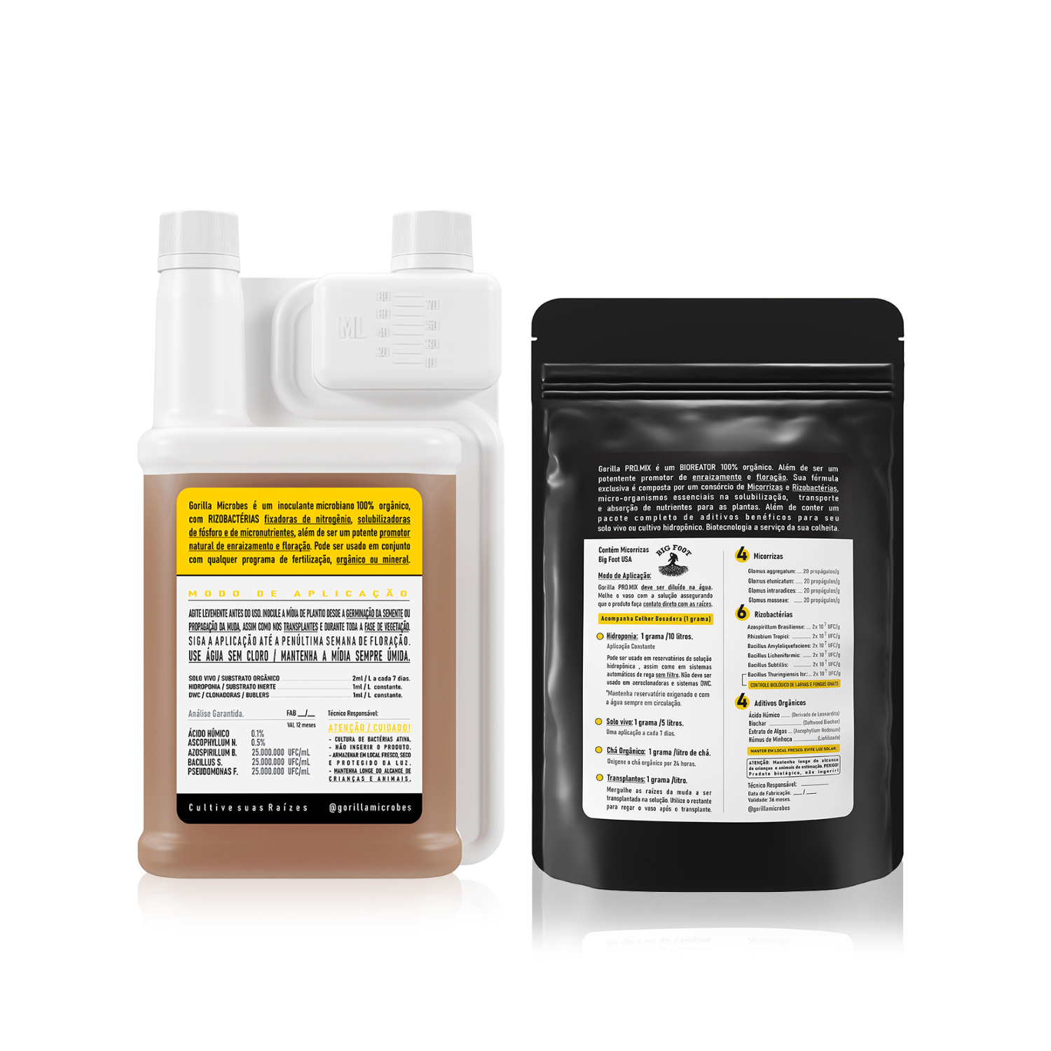 Gorilla PRO.MIX é um BIOREATOR 100% orgânico. Além de ser um potentente promotor de enraizamento e floração. Sua fórmula exclusiva é composta por um consórcio de Micorrizas e Rizobactérias, micro-organismos essenciais na solubilização, transporte e absorção de nutrientes para as plantas. Além de conter um pacote completo de aditivos benéficos para seu solo vivo ou cultivo hidropônico. Biotecnologia a serviço da sua colheita.