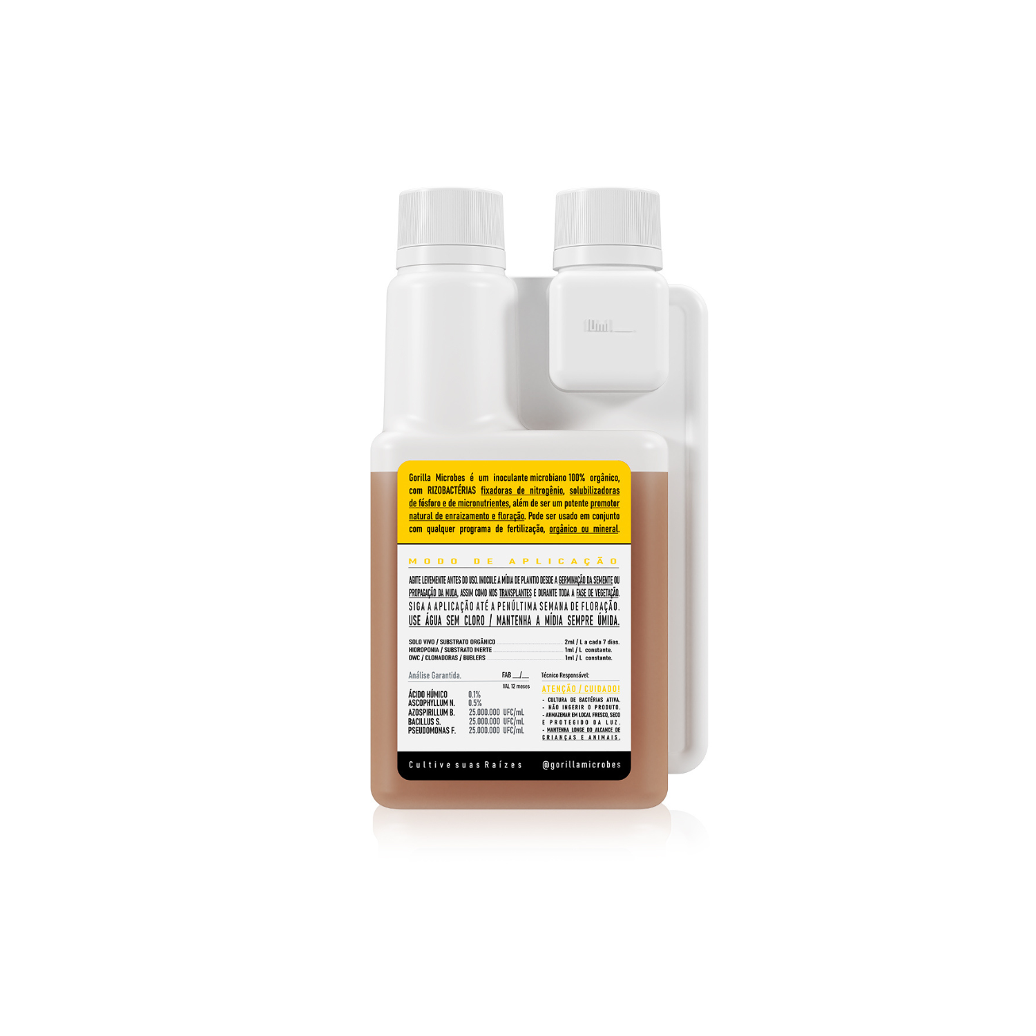 Gorilla Microbes é um biocatalisador microbiano constituído por bilhões de rizobactérias que promovem o crescimento vegetal de maneira eficaz e sustentável. Este produto, de alta qualidade e precisão técnica, é a solução ideal para otimizar a fixação biológica de nitrogênio no solo.